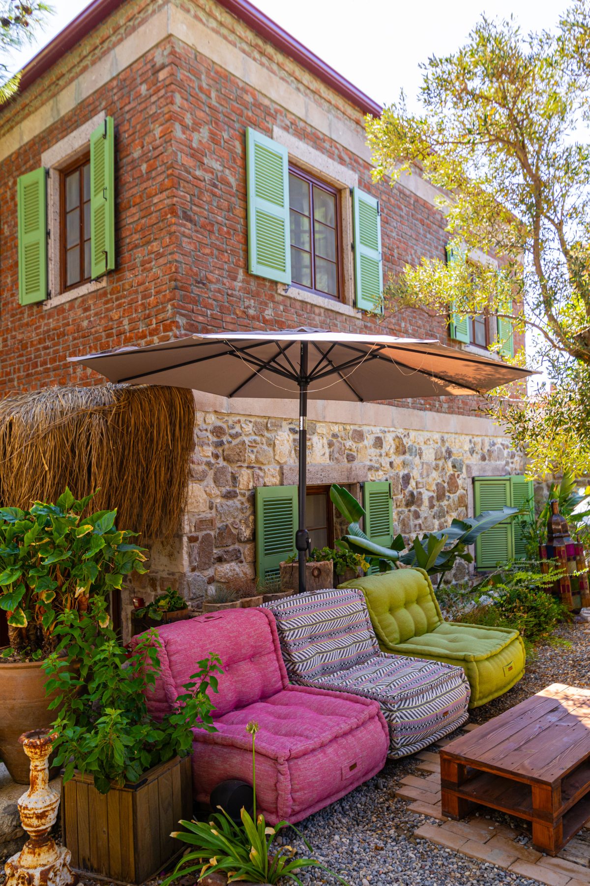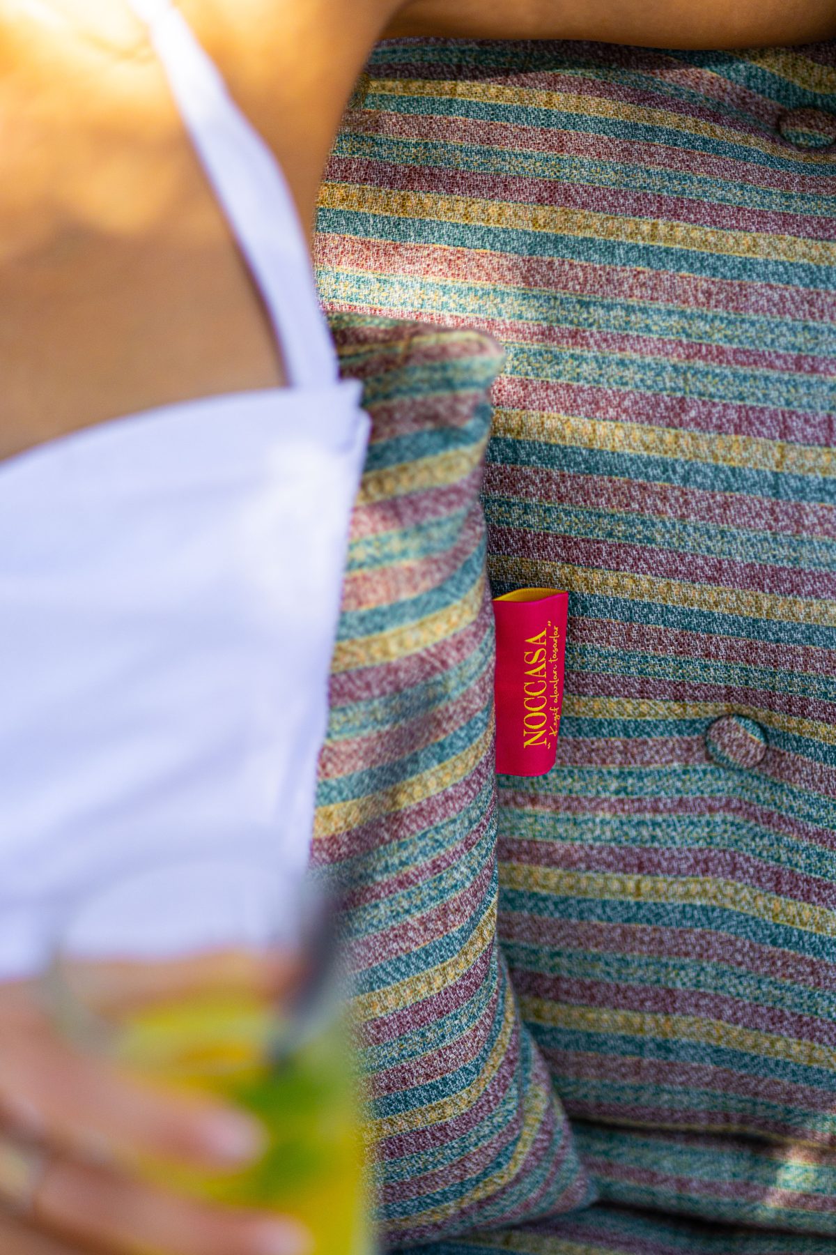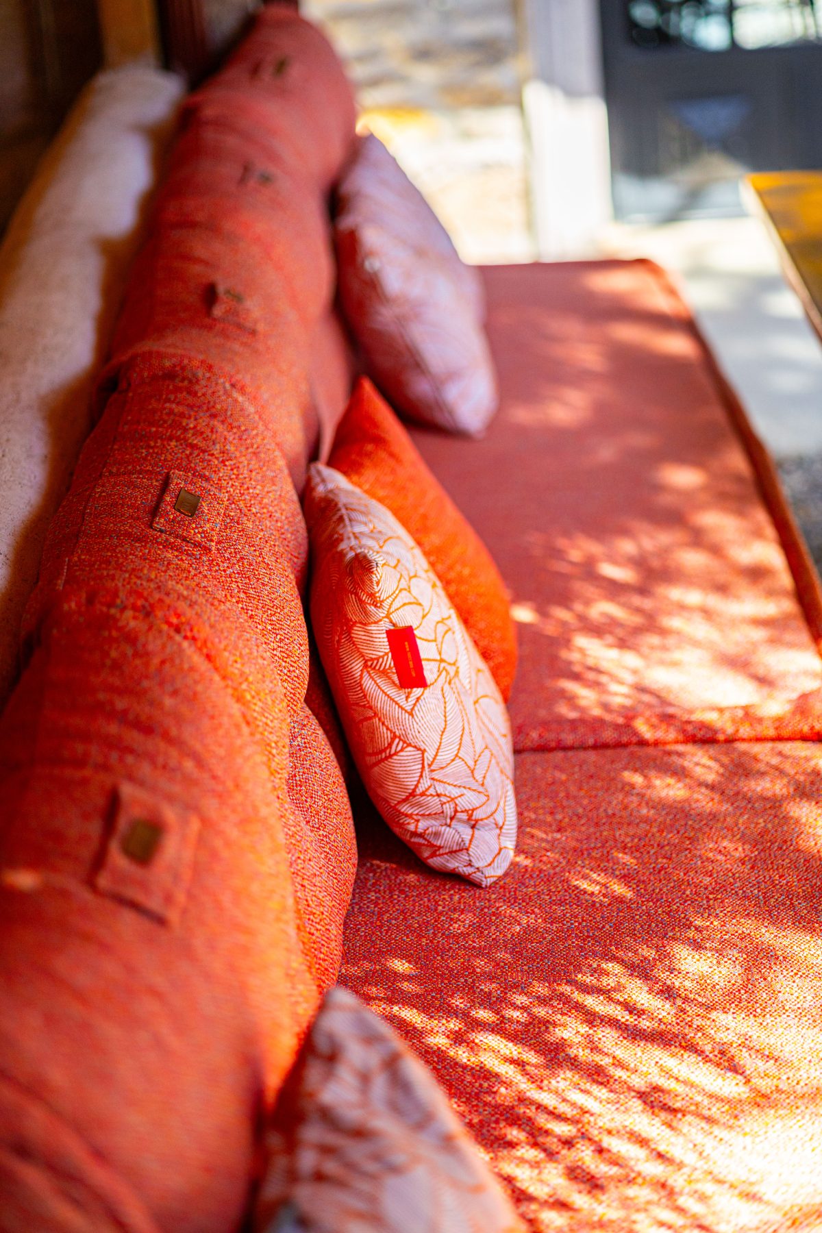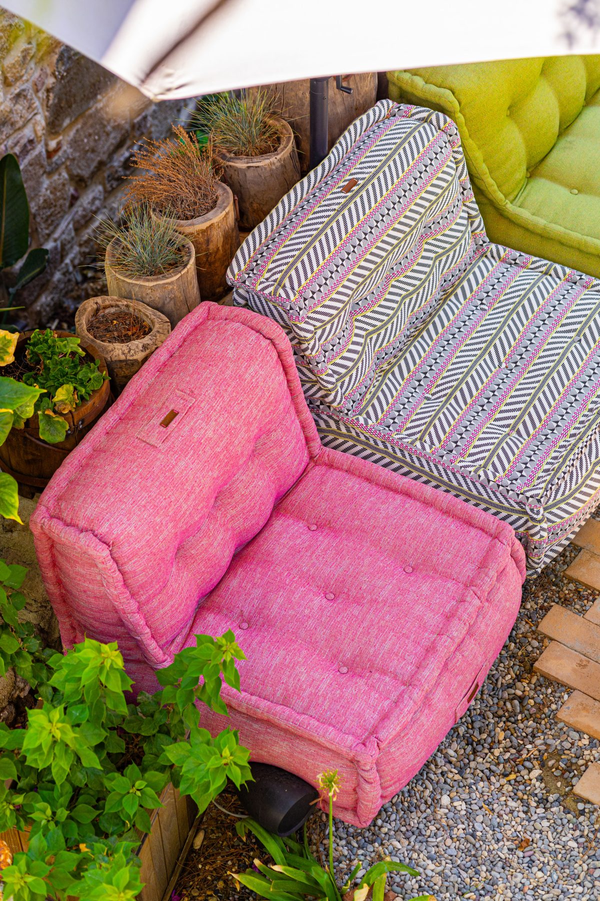 Fotoğrafta görülen doğal dokulu, el işçiliği hissi taşıyan yer minderleri, mekânda yalnızca bir oturma elemanı değil; aynı zamanda dinlenme, yavaşlama ve mekânla bağ kurma aracı olarak konumlanıyor. Ahşap zeminle kurdukları sıcak ilişki, Chi House Otel’in sade ve huzurlu mimari anlayışını desteklerken, Noccasa’nın zamansız tasarım yaklaşımını görünür kılıyor.
