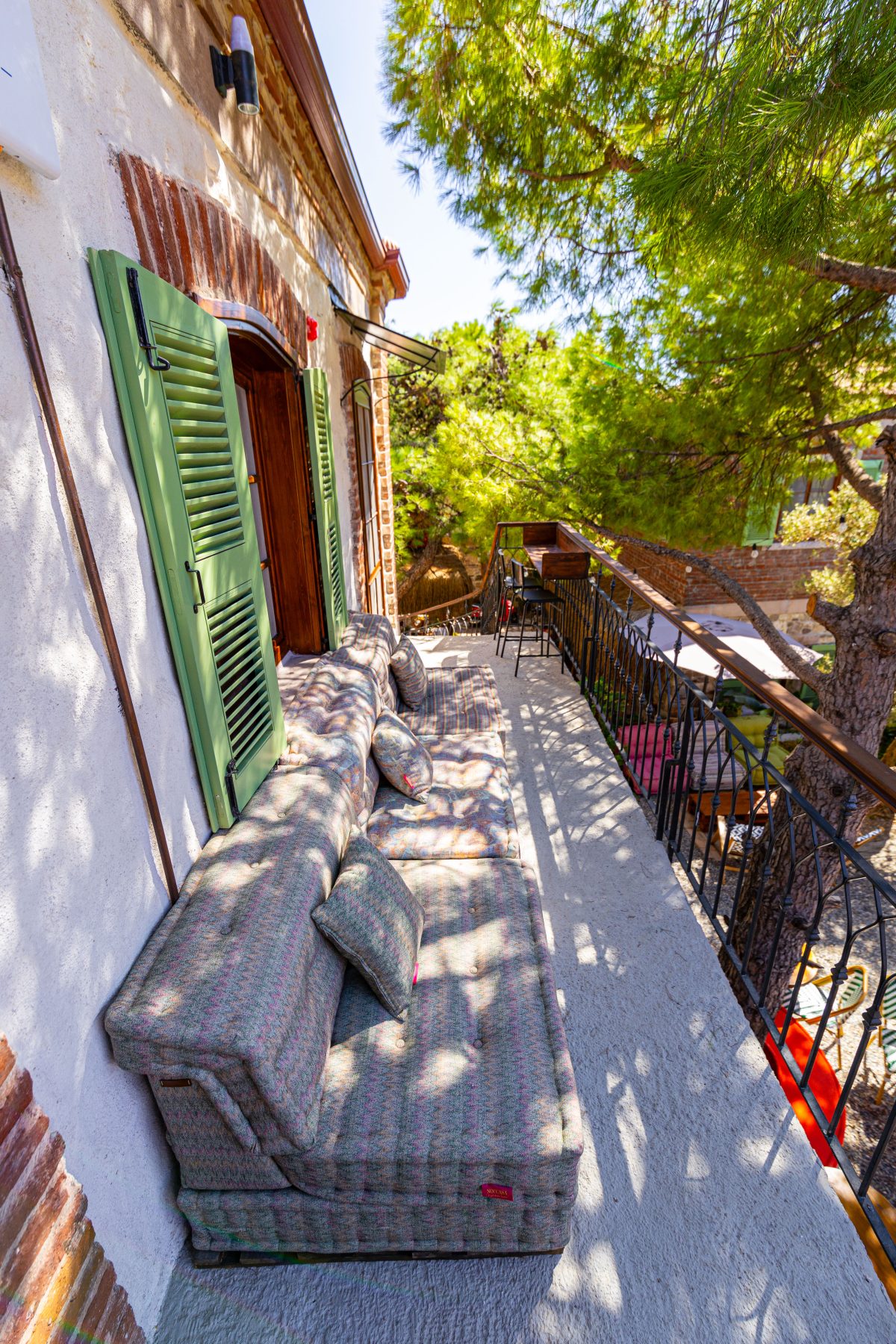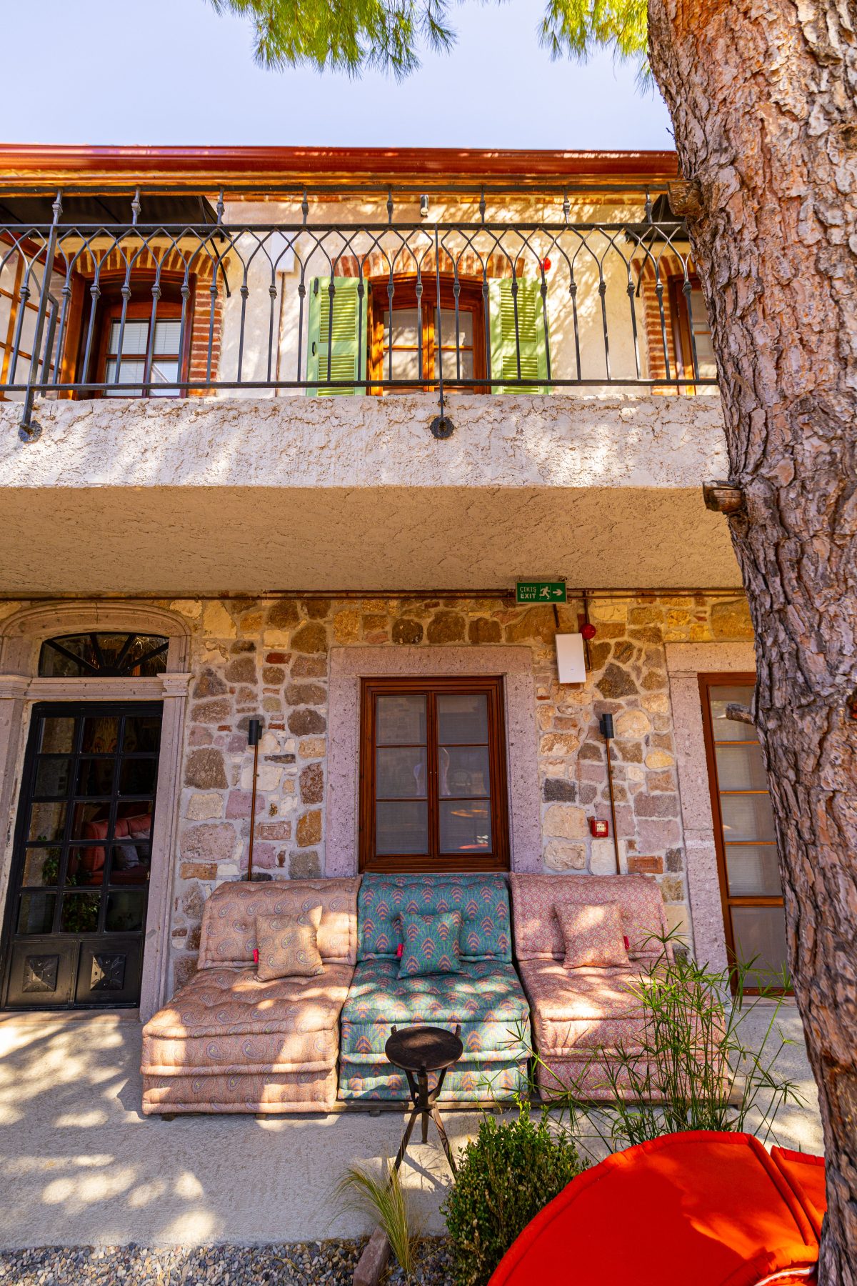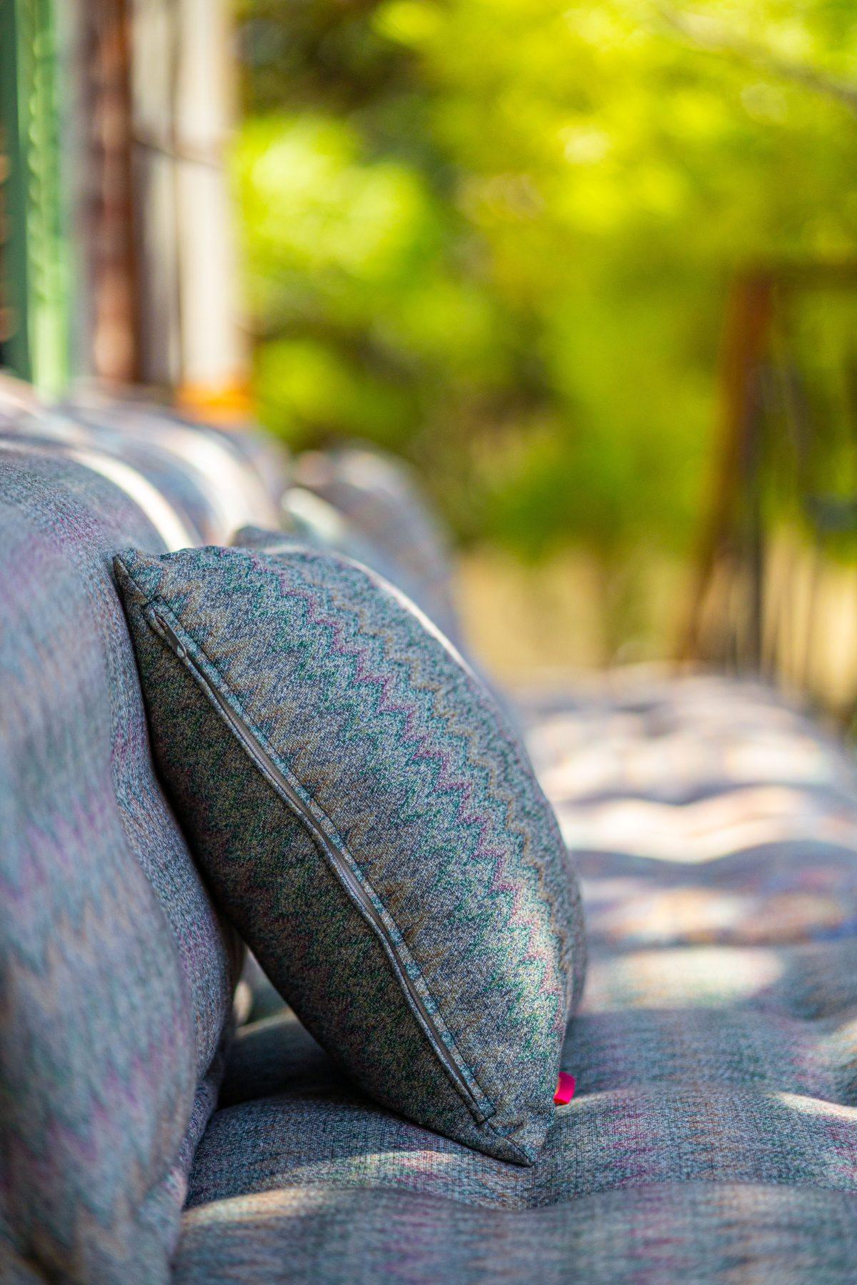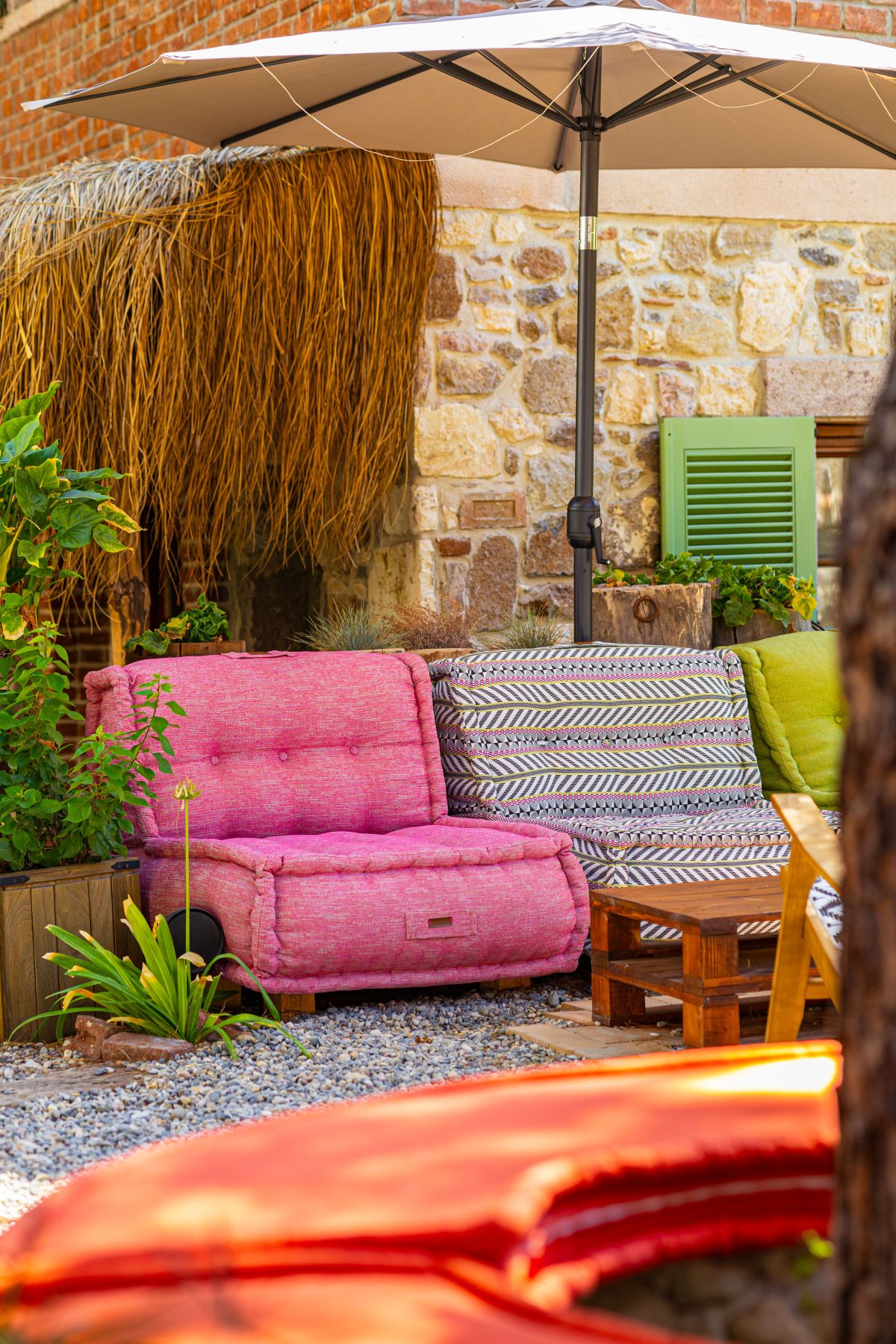 Fotoğrafta görülen doğal dokulu, el işçiliği hissi taşıyan yer minderleri, mekânda yalnızca bir oturma elemanı değil; aynı zamanda dinlenme, yavaşlama ve mekânla bağ kurma aracı olarak konumlanıyor. Ahşap zeminle kurdukları sıcak ilişki, Chi House Otel’in sade ve huzurlu mimari anlayışını desteklerken, Noccasa’nın zamansız tasarım yaklaşımını görünür kılıyor.