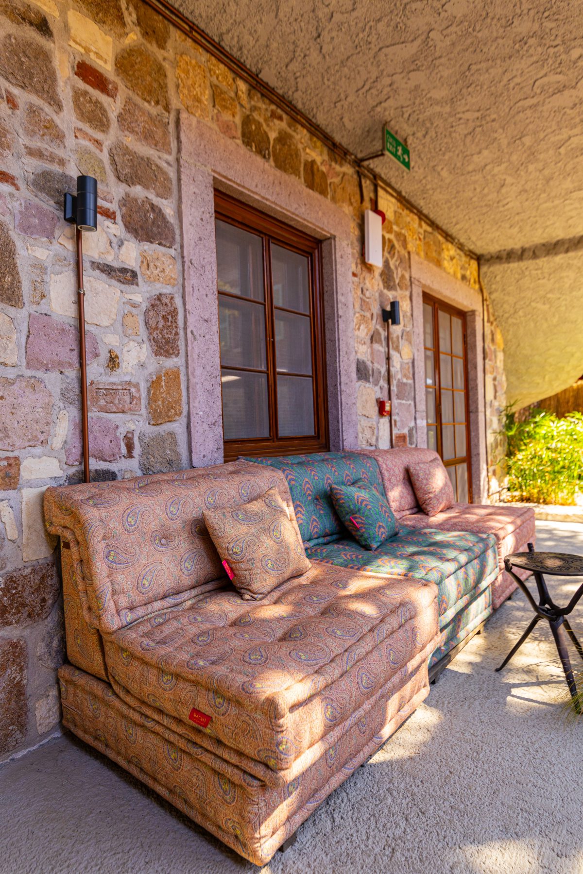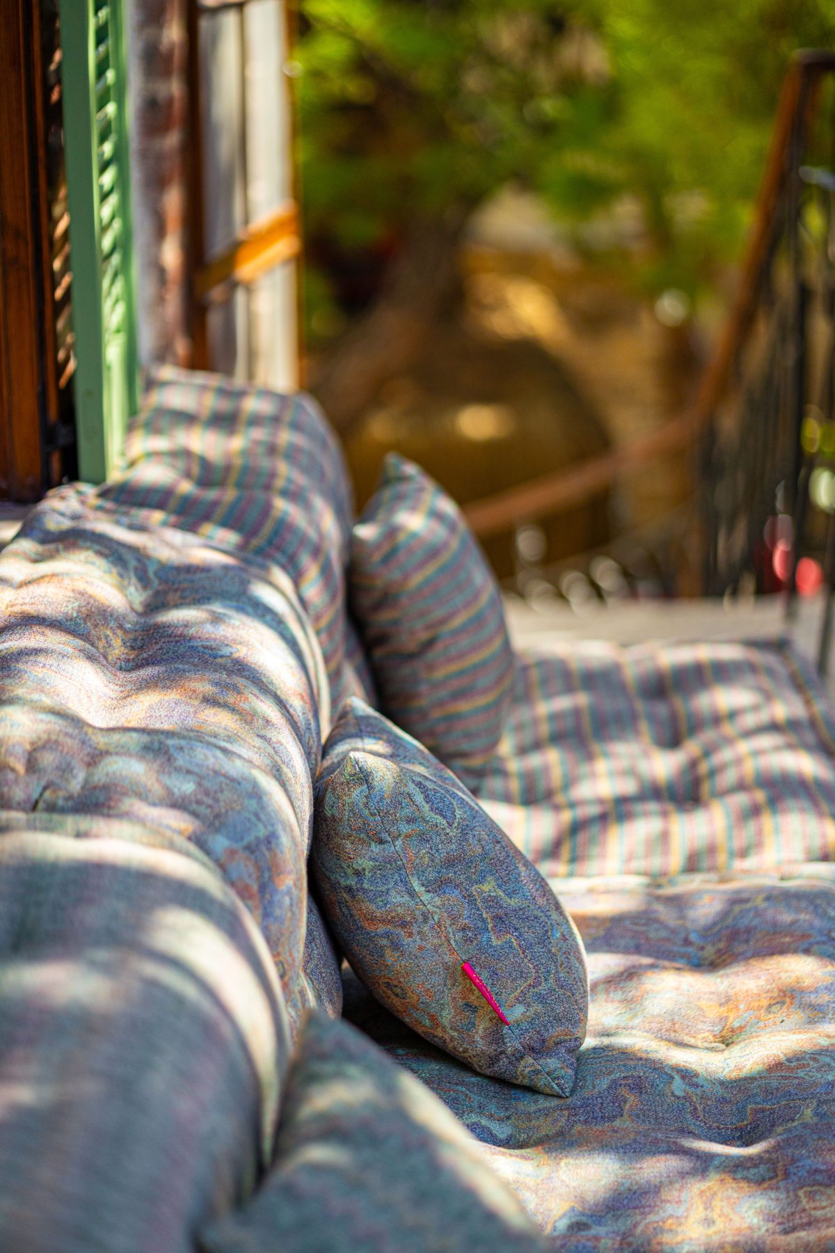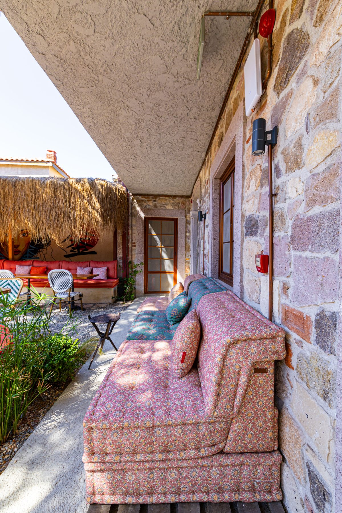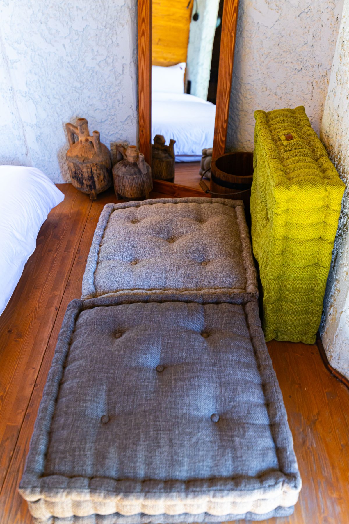 Katmanlı yapı, minderlerin hem fonksiyonel hem de mekânsal bir derinlik yaratmasını sağlıyor. Sert sınırların olmadığı bu kurgu, otel odasını klasik bir konaklama alanından çıkararak yaşanan, deneyimlenen bir mekâna dönüştürüyor. Işıkla birlikte değişen dokular ve doğal renkler, mekânda sakin ama karakterli bir atmosfer oluşturuyor.