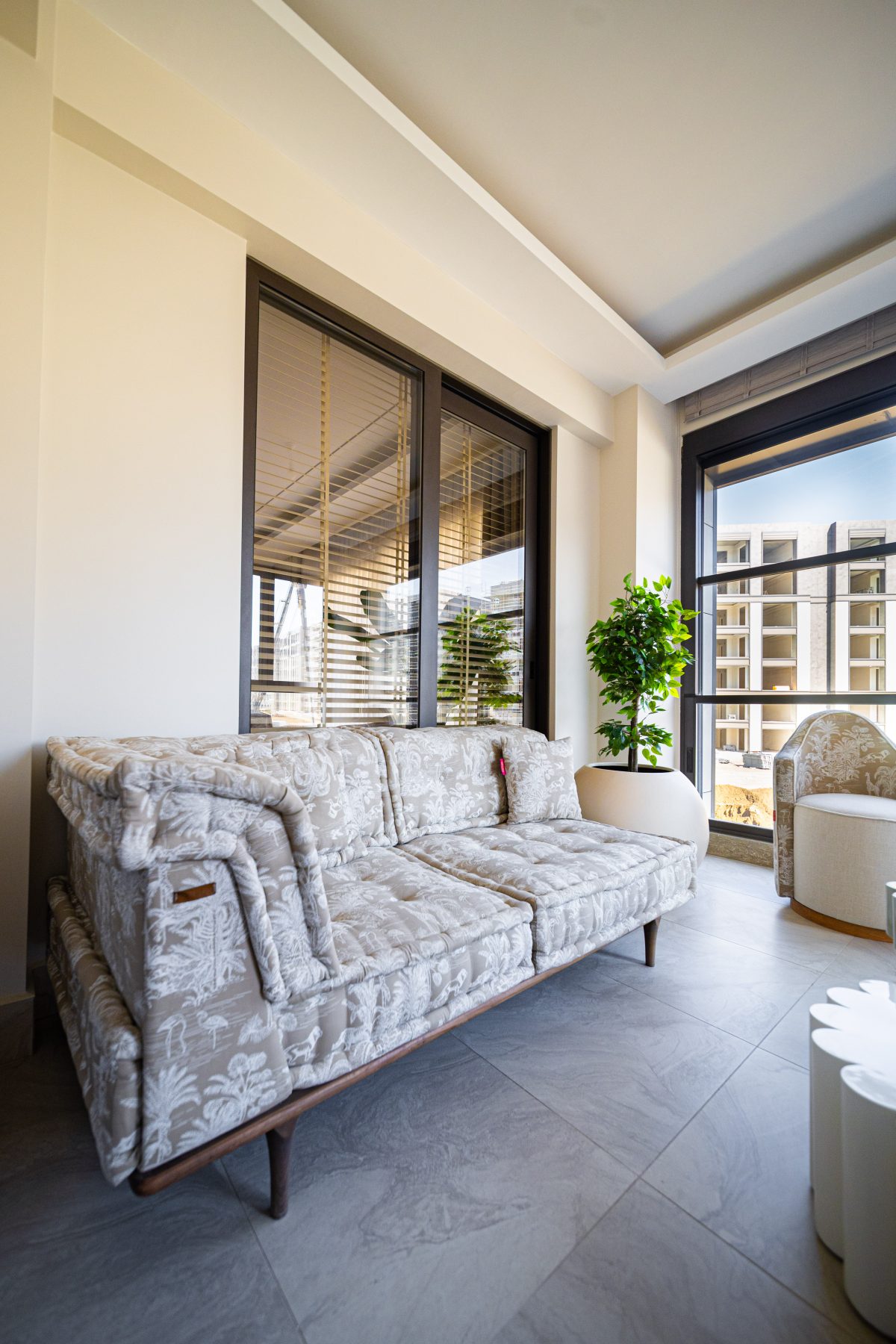 Karşılıklı yerleştirilen koltuklar ve tamamlayıcı berjerler, balkonun sosyal kullanımını destekleyen samimi bir düzen oluşturuyor. Ortada konumlanan yuvarlak sehpalar ise mekânın akışını kesmeden, tasarımın bütünlüğünü tamamlıyor. Geniş cam yüzeylerden içeri süzülen doğal ışık, kumaş dokularını öne çıkarırken, mekânda ferah ve dengeli bir atmosfer yaratıyor.