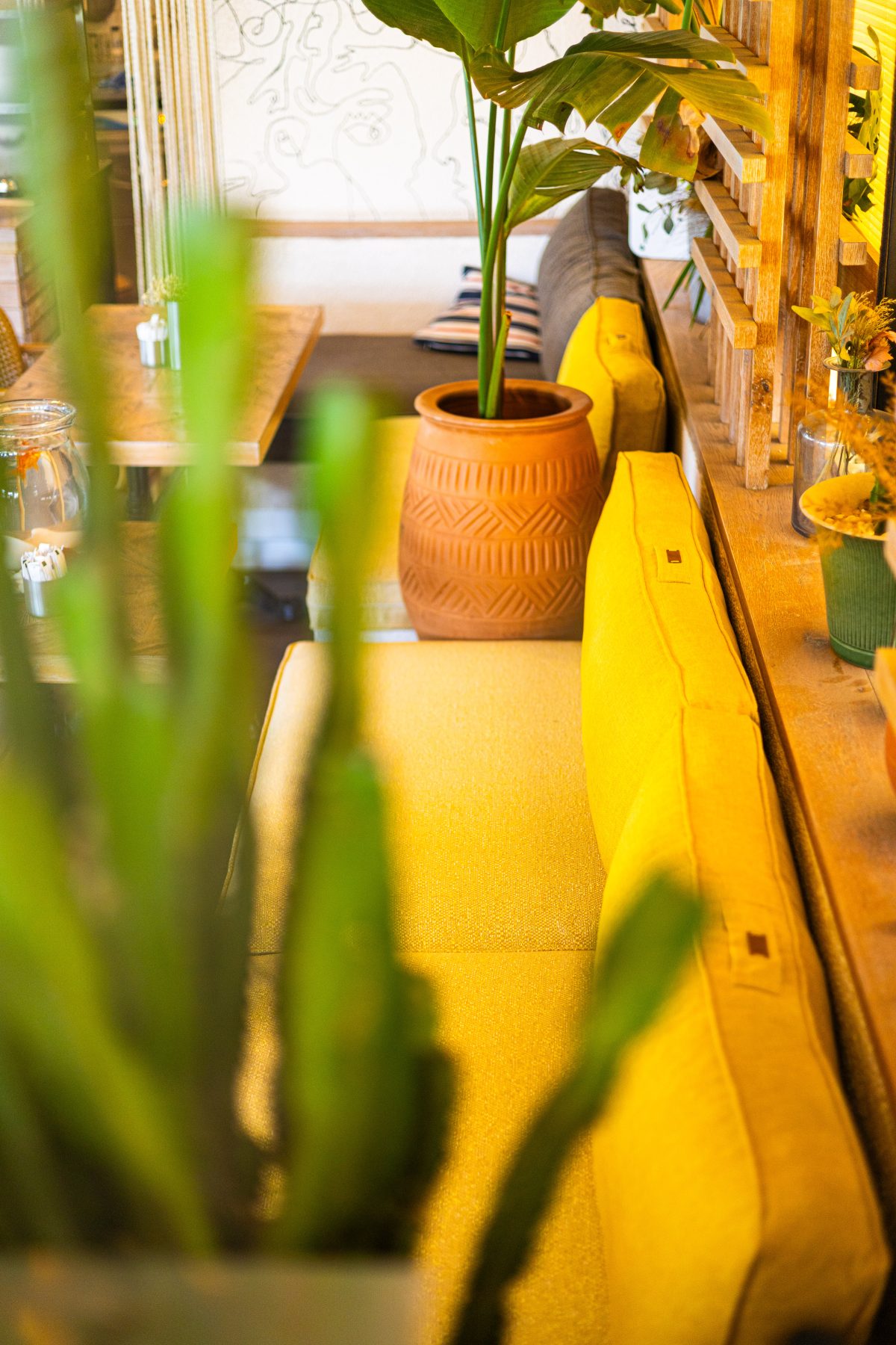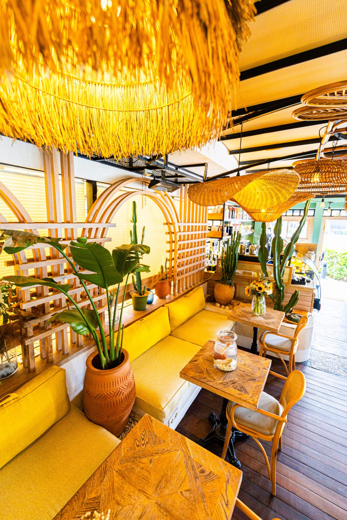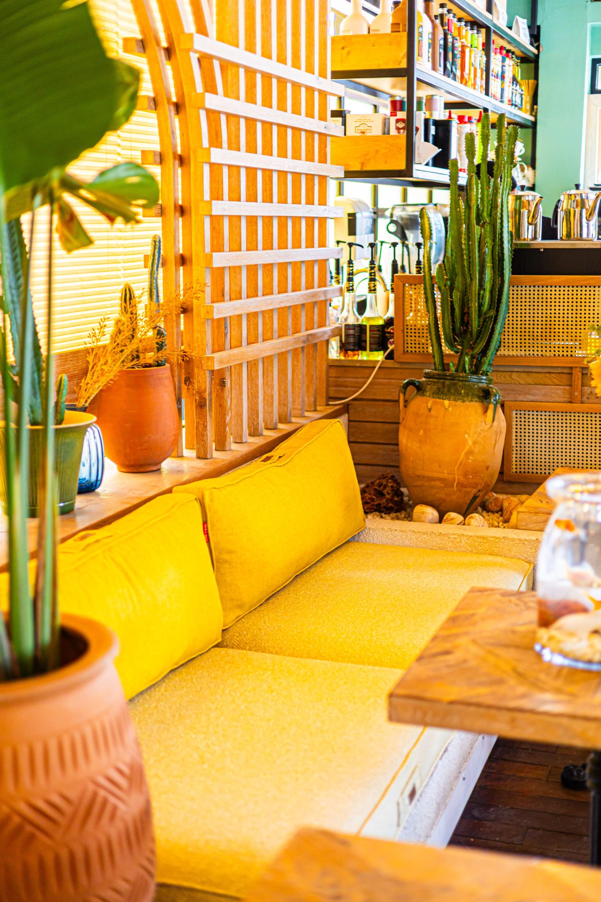Dış mekânda mavi tonlu oturumlar, yeşil doğrama detayları ve metal strüktürle birlikte sokakla güçlü bir bağ kurarken; iç mekânda bu hikâye sarı ve hardal tonlarıyla devam ediyor. Doğal ahşap yüzeyler, hasır aydınlatmalar ve bitkilerle desteklenen renk paleti, mekânın samimi ve davetkâr karakterini güçlendiriyor.