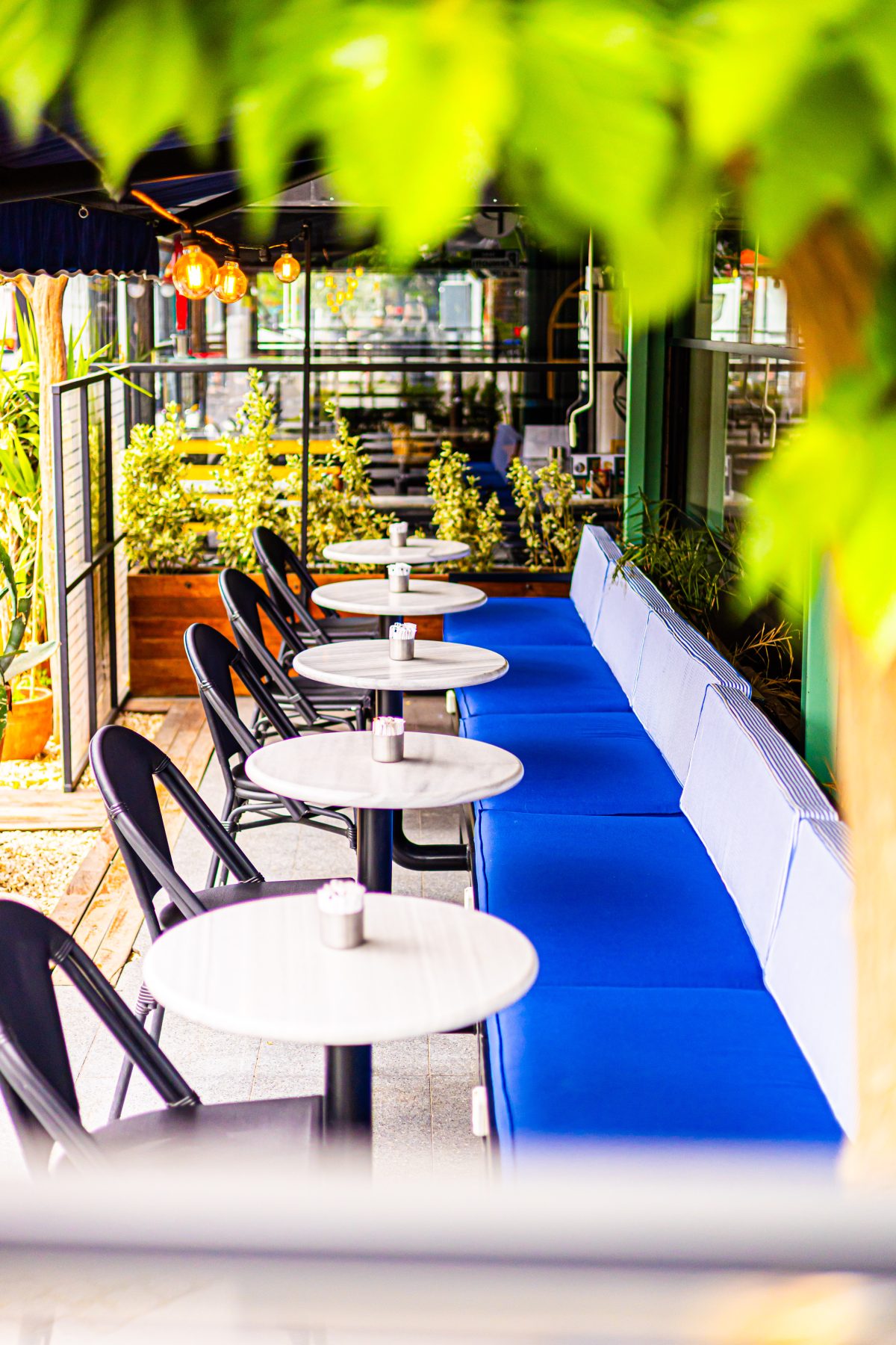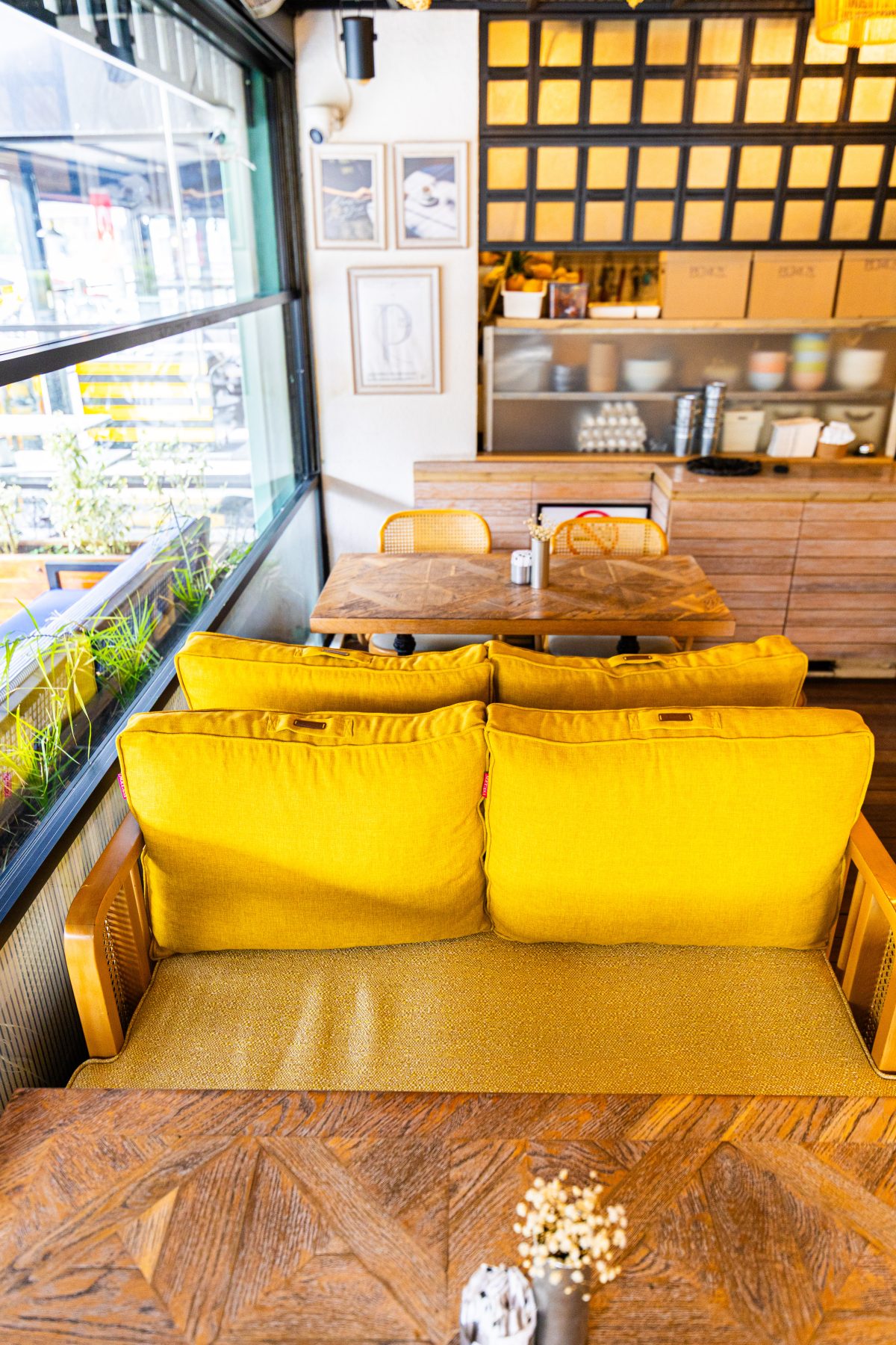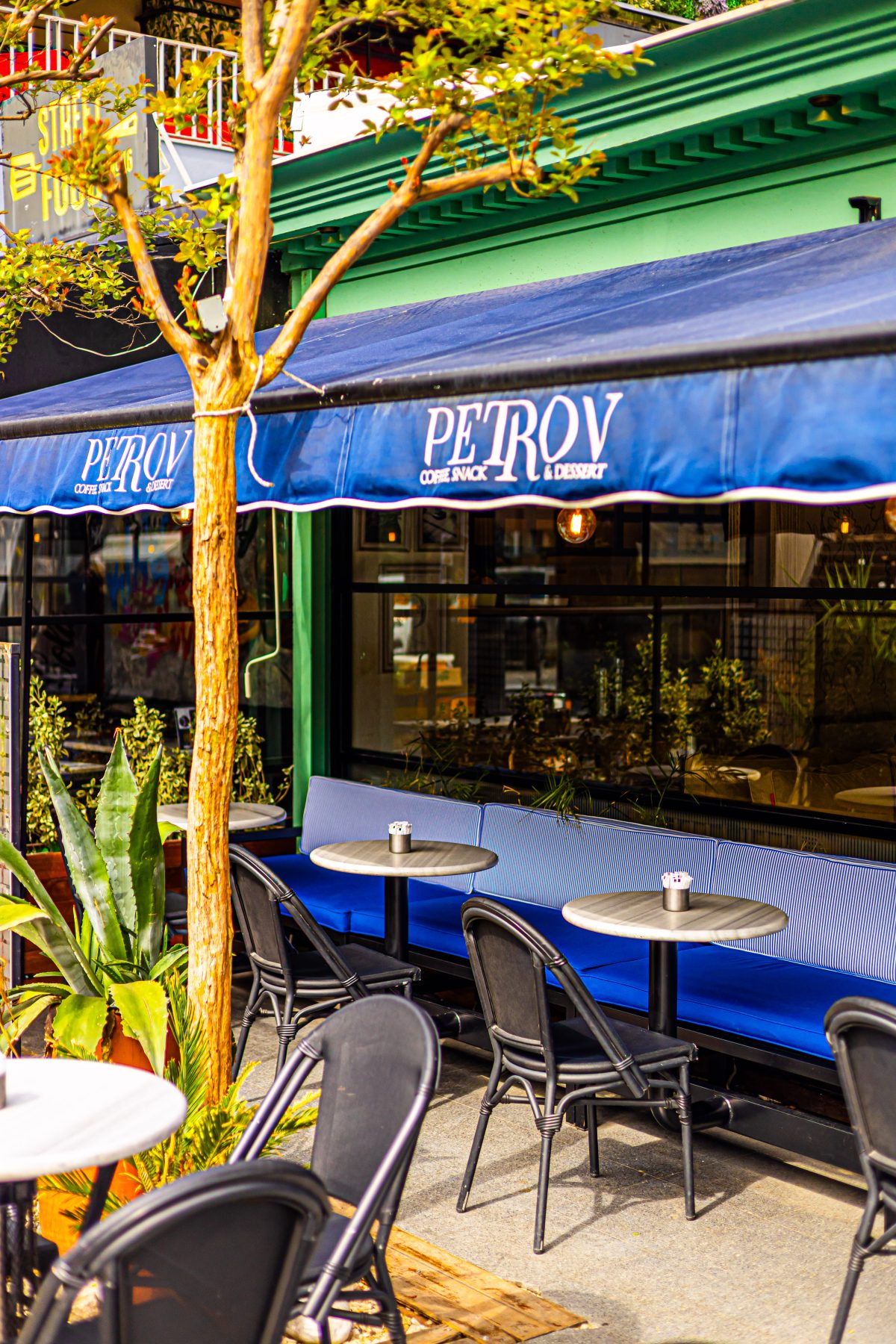 Dış mekânda mavi tonlu oturumlar, yeşil doğrama detayları ve metal strüktürle birlikte sokakla güçlü bir bağ kurarken; iç mekânda bu hikâye sarı ve hardal tonlarıyla devam ediyor. Doğal ahşap yüzeyler, hasır aydınlatmalar ve bitkilerle desteklenen renk paleti, mekânın samimi ve davetkâr karakterini güçlendiriyor.